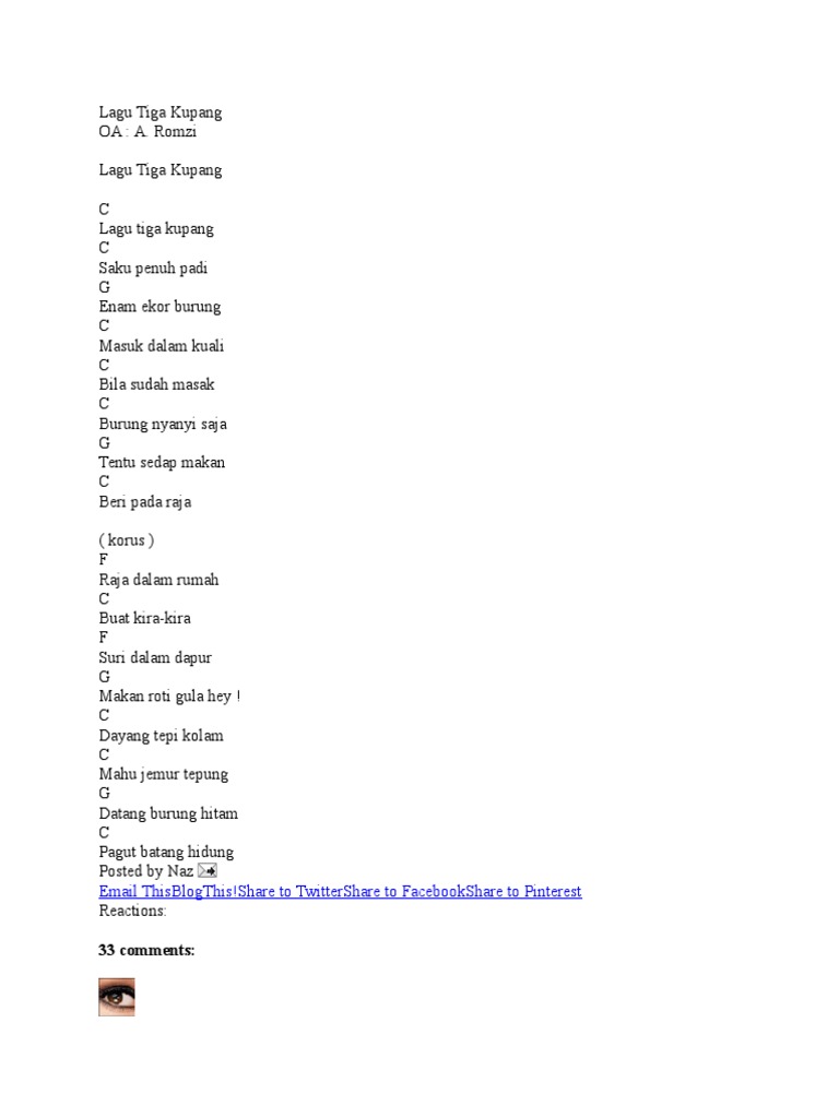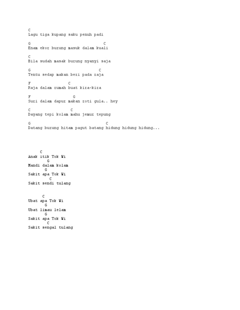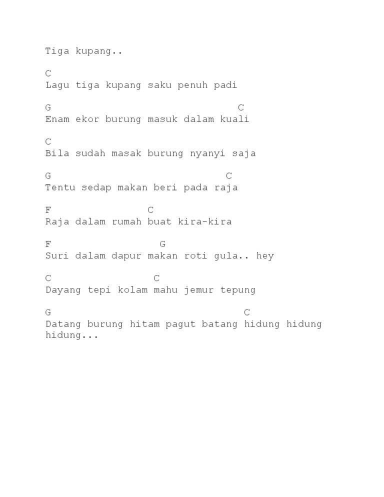 Muzik adalah sebuah fenomena yang sangat unik. 9 years ago English KSSR Year 1. Lagu tiga kupang sagu penuh padi C5ii enam ekor burung F5i masok dalam kuali bila sudah masak burung nyanyi saja C5ii tentu sedap makan F5i beri pada raja B5i Raja dalam rumah F5ii buat kira kira B5i suri dalam dapur C5i slide back to F5i makan roti gula F5i dayang tepi kolam mahu jemur tepung C5ii datang burung.